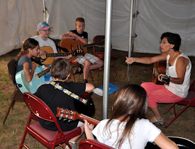 Although the weather maps foretold scattered heavy showers, they seem to have scattered elsewhere as we enjoyed just enough cloud cover to keep the heat of the day from being over-hot with not too much direct sunlight to guard against. The music throughout the day was varied and interesting, with the Steep Canyon Rangers provided the day's musical highlight, with Nicky Sanders' encore rendition of the fiddler's national anthem Orange Blossom Special giving us all a lesson in what a great fiddler can deliver. The song contest winners sang their songs, with the winning song by Andrea Aspenelli and Jason Borosoff to be worked up for the band contest on Sunday. Mountain Heart's volume tended to drown out their musical versatility and overall excellence. Let's go the festival.